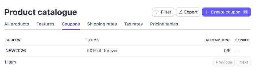 - In Stripe, in the 'Product catalogue' section under 'Coupons'.