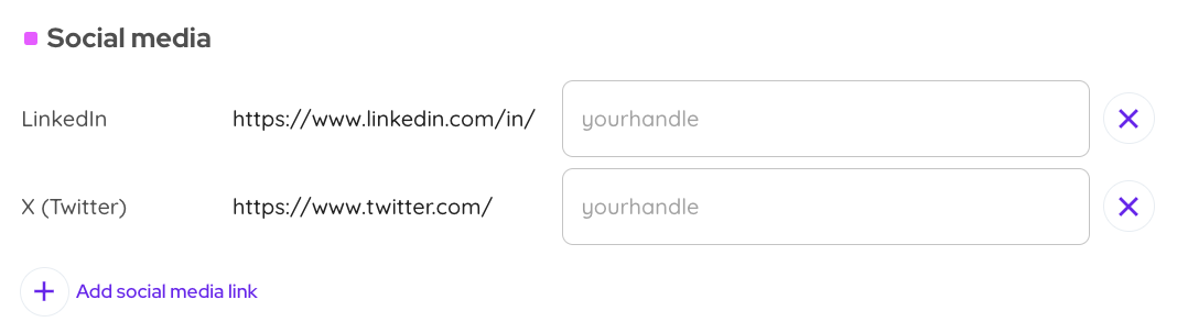 You can link to your Linked, X (Twitter), Instagram, Facebook, YouTube and TikTok pages.