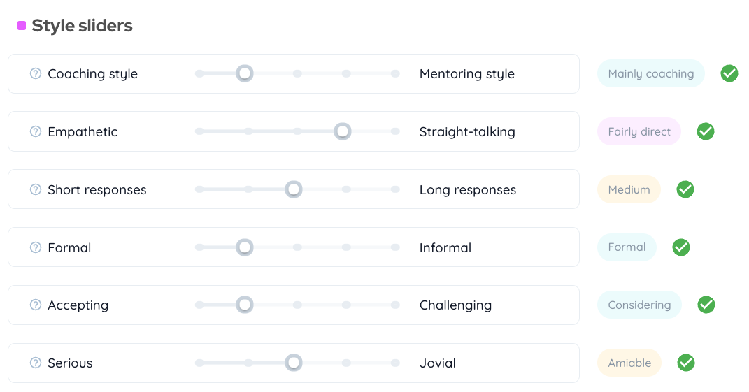 - Your personality and tone of voice - Describe your communication style, your tone of voice and your approach to supporting people. And don't hold back - the more specific, the better! This field has the second biggest influence on how your AI sounds after your training data, so it's worth giving it some thought.
