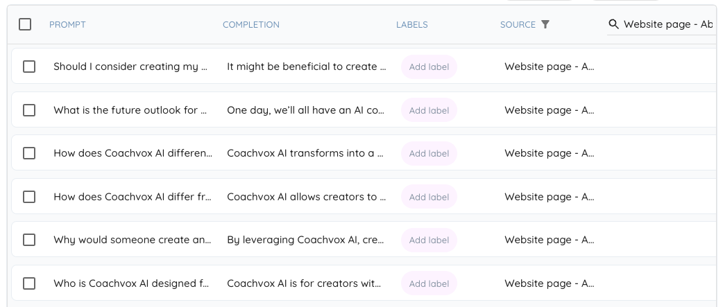 You can also upload a CSV file of prompts and completions directly to your training data: