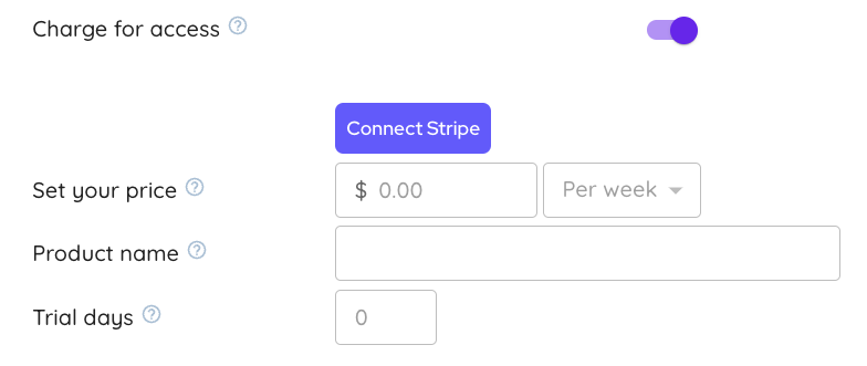 Once you've connected and verified a Stripe account and created a subscription within your Coachvox account, additional fields for setting up coupons will appear in the charge for access section.