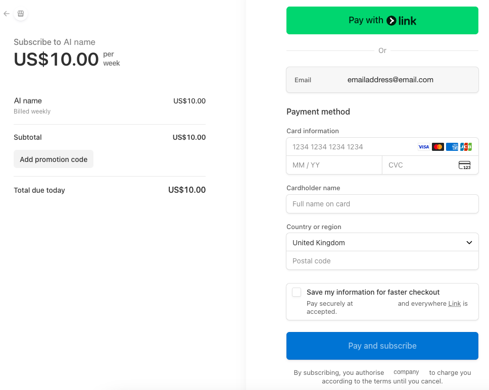You can use our in-built payment feature, operated through the trusted payment platform Stripe, to charge for access to your AI. Find this in your AI settings.