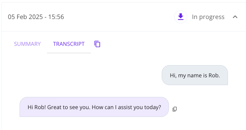 Note: Chats are shown as "in progress" until 24 hours after the last message or sooner if the user begins a new conversation. This allows your clients to step away and then return to the conversation where they left off. You can still view the transcript when a chat is in progress.