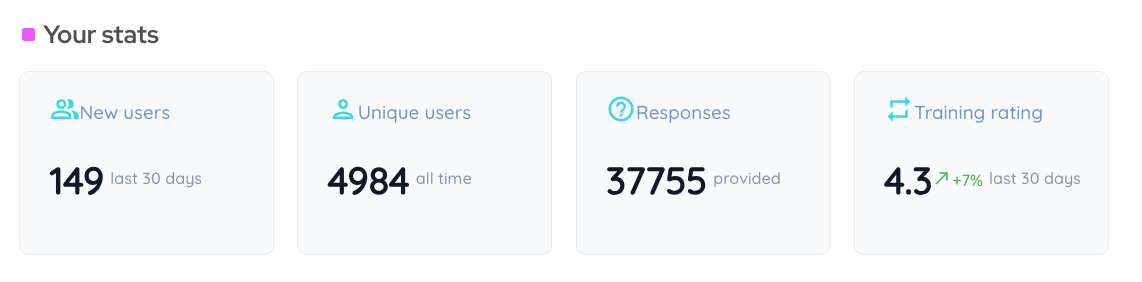 - Check regularly - See your AI improve, monitor the growth in user numbers, spot trends in usage patterns and review your weekly audience challenges.