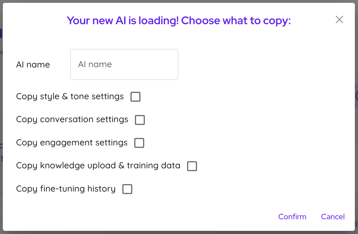 - Tick the boxes if you wish to copy over any training information from your first AI.